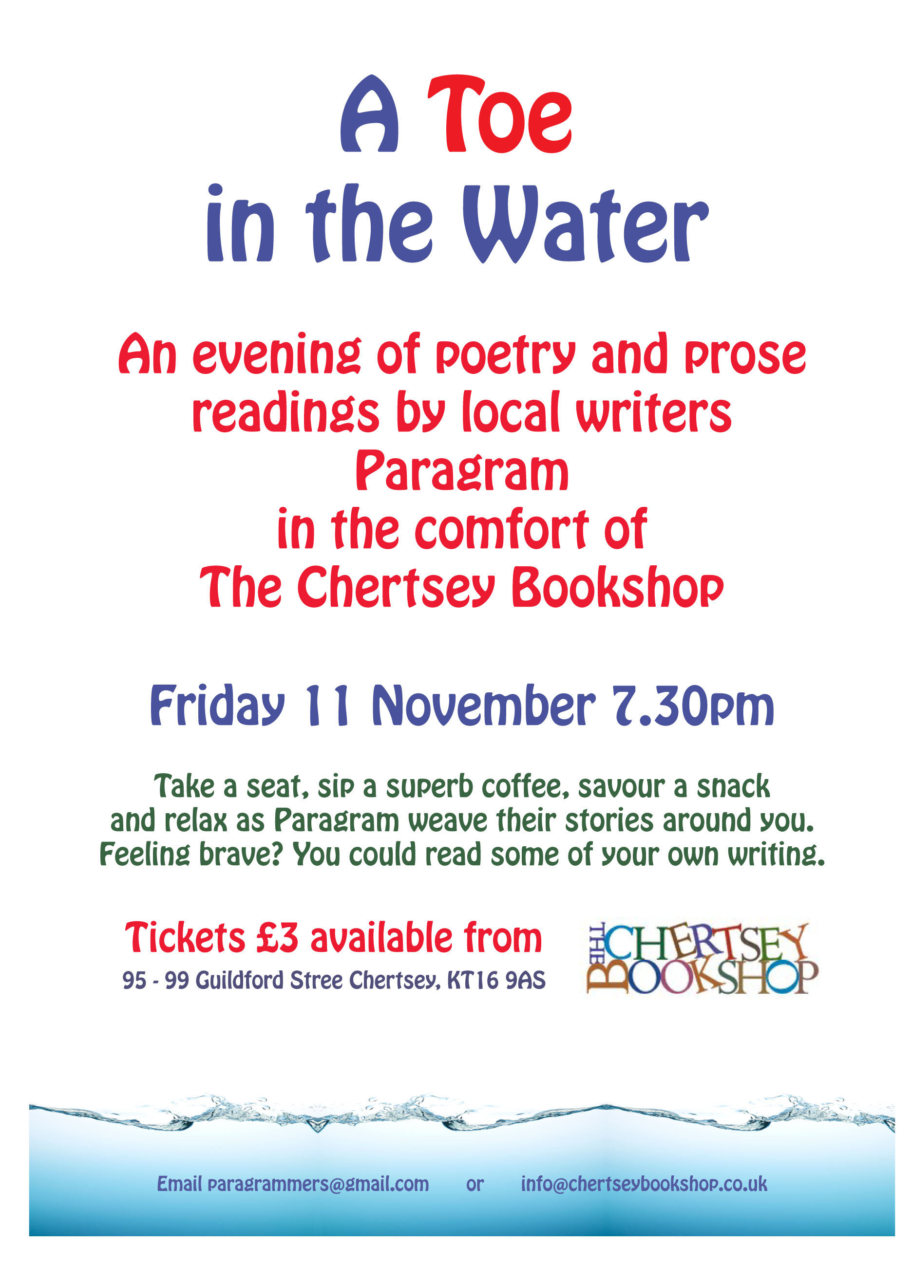 We have found many friendly local businesses in Chertsey and the surrounding area who are willing to display our posters, and we owe them all a big thank you. We have organised a press release and contacted local radio. Thanks to Greg Freeman for adding it to the ‘Write Out Loud’ website. Those of us with Facebook pages have advertised an ‘event’. The great people at the Chertsey Bookshop are doing their best to bring the event to the public’s notice, we have pestered all the ‘contacts’ on our email accounts….so what have we forgotten?
