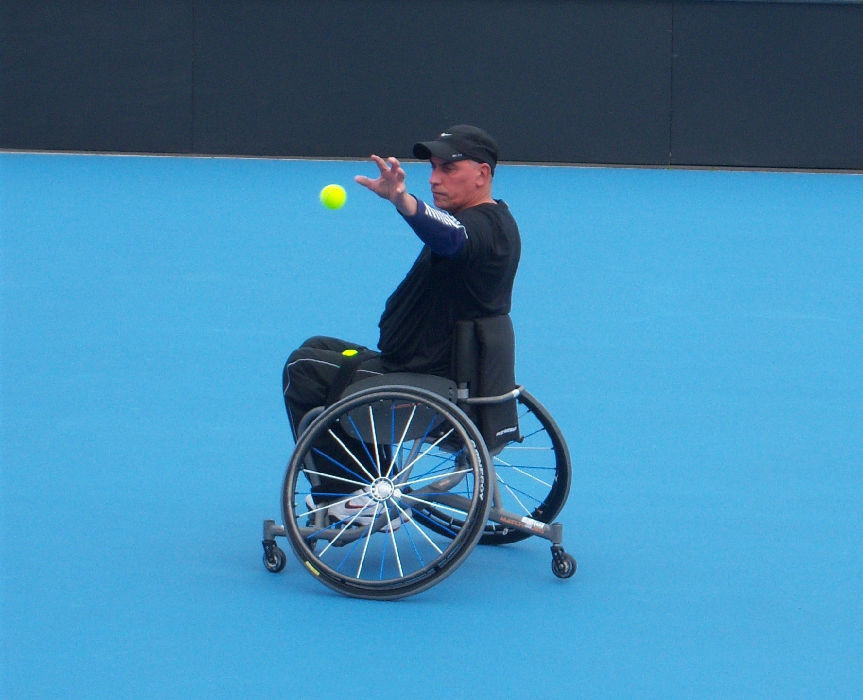 During the warm-up I concentrated on each athlete in turn and soon realised that each was very different in the way they stroked and served the ball, but they shared on great talent – incredible accuracy with their shots. They seemed to instinctively know exactly where they were in relation to the court, even when they had their backs to play, which often they did in order to make their shot. Their wheelchairs were more like…supercharged chariots, stabilised with an extra framework of three fast spinning trolley type wheels which kept balance as they spun and twirled on their negative camber main wheels. One hand stopping, starting, guiding the chair, while the other completed complex saves and shots to fight out every point.
